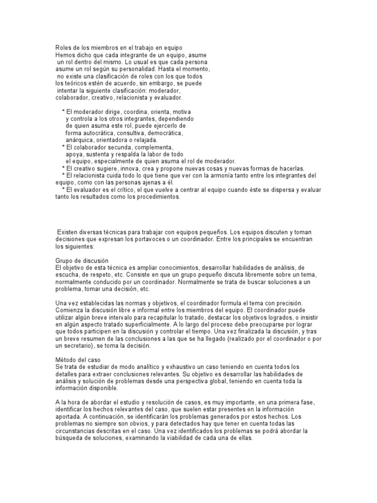 mismo. Lo usual es que cada persona asume un rol segn su personalidad. Hasta el momento, no existe una clasificacin de roles con los que todos los tericos estn de acuerdo, sin embargo, se puede intentar la siguiente clasificacin: moderador, colaborador, creativo, relacionista y evaluador. * El moderador dirige, coordina, orienta, motiva y controla a los otros integrantes, dependiendo de quien asuma este rol, puede ejercerlo de forma autocrtica, consultiva, democrtica, anrquica, orientadora o relajada. * El colaborador secunda, complementa, apoya, sustenta y respalda la labor de todo el equipo, especialmente de quien asuma el rol de moderador. * El creativo sugiere, innova, crea y propone nuevas cosas y nuevas formas de hacerlas. * El relacionista cuida todo lo que tiene que ver con la armona tanto entre los integrantes del equipo, como con las personas ajenas a l. * El evaluador es el crtico, el que vuelve a centrar al equipo cuando ste se dispersa y evaluar tanto los resultados como los procedimientos.