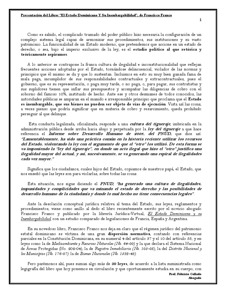 Con este trabajo, el joven abogado e incipiente escritor Francisco Franco, de 24 aos de edad, nos sorprende por su enjundia, profundidad de juicio y capacidad analtica, y demuestra la falsedad del estereotipo que se ha formado de las ltimas dos tres generaciones, en las que primara la superficialidad, su lejana de la actividad intelectual y el desinters por su pas y lo correcto, y la falta de capacidad crtica. Y es que suelen olvidar que las sociedades siempre tienen vanguardias que concentran en s misma la tradicin y legado de lo mejor. Esperamos que este libro no sea la voz que clama en el desierto y que algn da, ojal no est lejano, el Estado Dominicano cuente con un rgimen patrimonial sustentado en principios justos que armonicen los intereses del pueblo y los intereses econmicos, un Estado que cumpla sus propias leyes, y as revitalice la moral pblica. Es ms, me atrevera a asegurar que bastara con que cada dependencia estatal cumpla los reglamentos internos, que existen en todas, pero que hasta los altos funcionarios ignoran su existencia y, como es lgico, jams los han ledo.