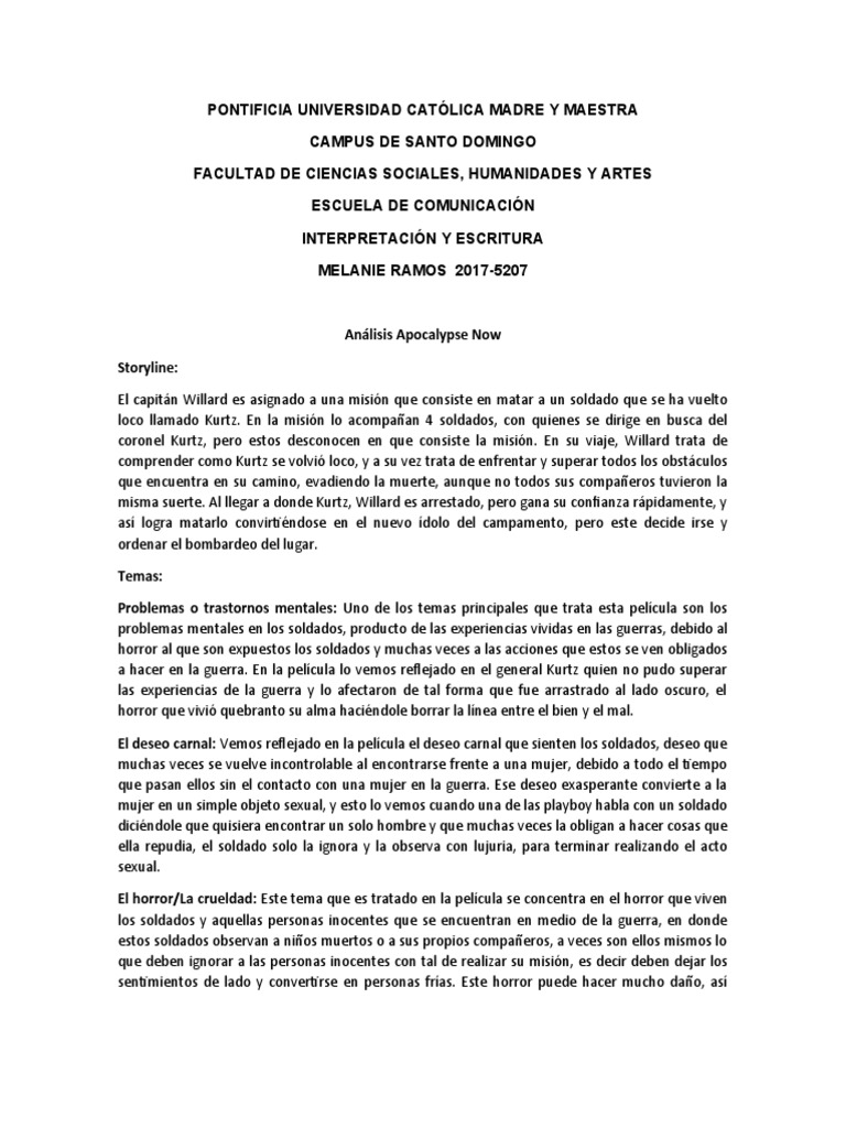 coronel Kurtz, pero estos desconocen en que consiste la misión. En su viaje, Willard trata de