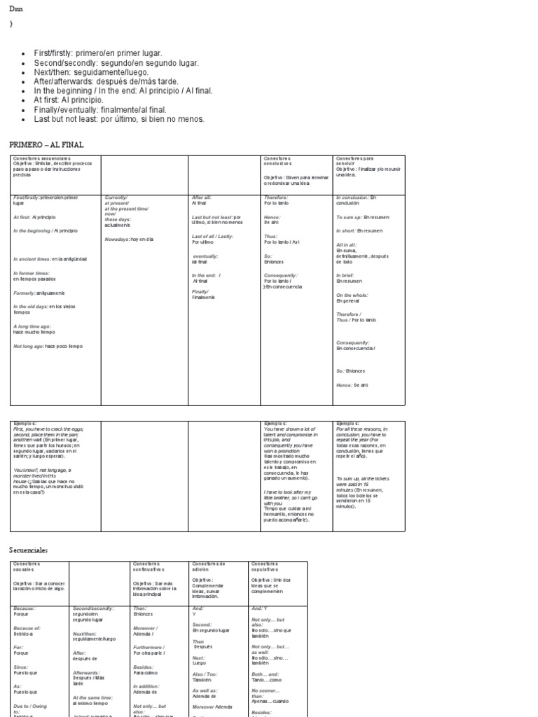 First/firstly: primero/en primer Currently/ After all: Therefore: In conclusion: En