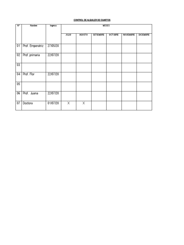 Este documento es una tabla que registra el control de alquiler de cuartos de inquilinos. La tabla incluye el número, nombre, ingreso y meses de julio a diciembre, marcando pagos realizados para cada inquilino.