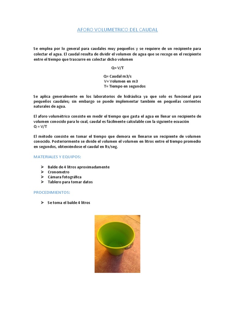 El aforo volumétrico consiste en medir el tiempo que gasta el agua en llenar un recipiente de