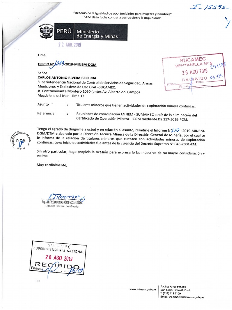 Tengo el agrado de crime a usted y en relacién al asunto,remitirle el Informe N“G/0 -2019-MINEM-