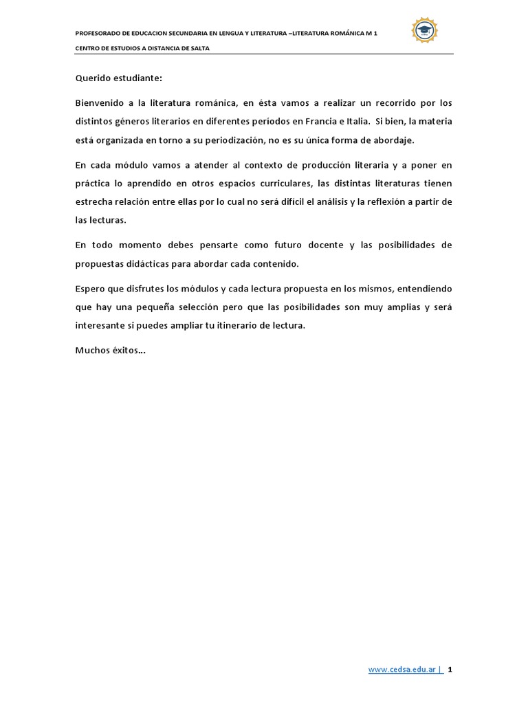 PROFESORADO DE EDUCACION SECUNDARIA EN LENGUA Y LITERATURA –LITERATURA ROMÁNICA M 1