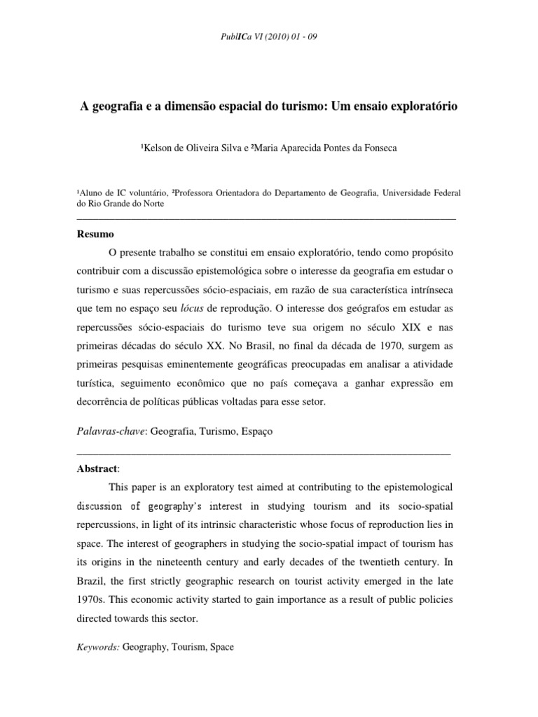 ______________________________________________________________________ Resumo O presente trabalho se constitui em ensaio exploratrio, tendo como propsito contribuir com a discusso epistemolgica sobre o interesse da geografia em estudar o turismo e suas repercusses scio-espaciais, em razo de sua caracterstica intrnseca que tem no espao seu lcus de reproduo. O interesse dos gegrafos em estudar as repercusses scio-espaciais do turismo teve sua origem no sculo XIX e nas primeiras dcadas do sculo XX. No Brasil, no final da dcada de 1970, surgem as primeiras pesquisas eminentemente geogrficas preocupadas em analisar a atividade turstica, seguimento econmico que no pas comeava a ganhar expresso em decorrncia de polticas pblicas voltadas para esse setor. Palavras-chave: Geografia, Turismo, Espao _____________________________________________________________________ Abstract: This paper is an exploratory test aimed at contributing to the epistemological discussion of geographys interest in studying tourism and its socio-spatial repercussions, in light of its intrinsic characteristic whose focus of reproduction lies in space. The interest of geographers in studying the socio-spatial impact of tourism has its origins in the nineteenth century and early decades of the twentieth century. In Brazil, the first strictly geographic research on tourist activity emerged in the late 1970s. This economic activity started to gain importance as a result of public policies directed towards this sector.