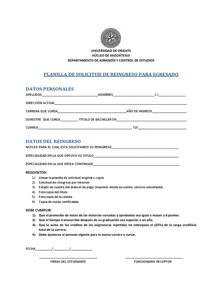 PLANILLA DE SOLICITUD DE REINGRESO PARA EGRESADO
