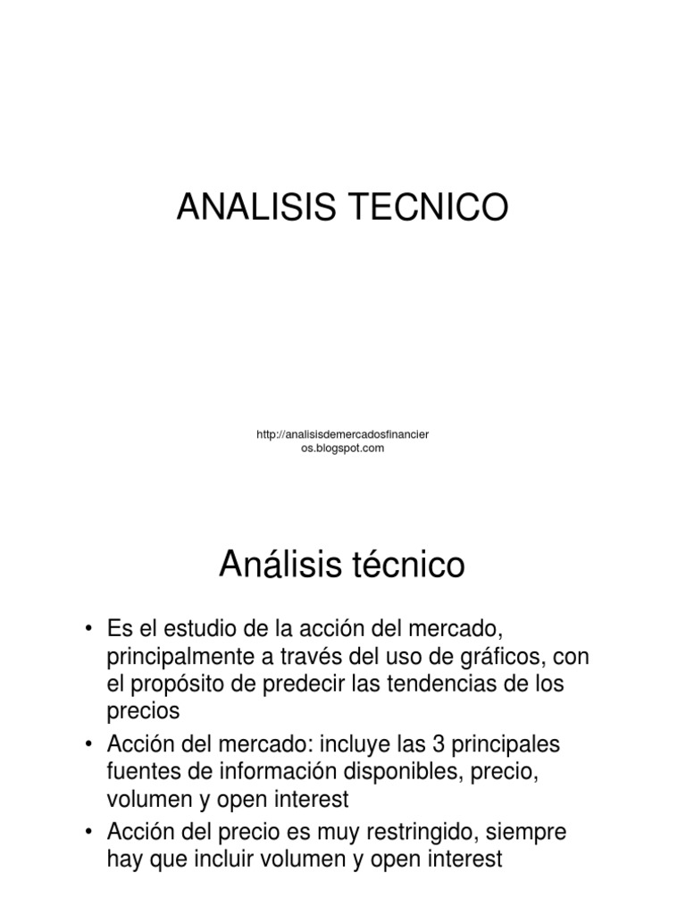 Es el estudio de la accin del mercado, principalmente a travs del uso de grficos, con el propsito de predecir las tendencias de los precios Accin del mercado: incluye las 3 principales fuentes de informacin disponibles, precio, volumen y open interest Accin del precio es muy restringido, siempre hay que incluir volumen y open interest