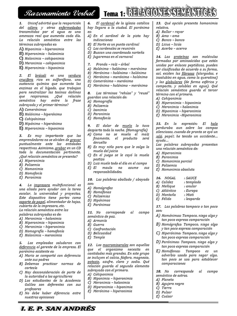 B) Hidrógeno, oxígeno – agua B) Homonimia – polisemia 118. VERANO : PESCADO