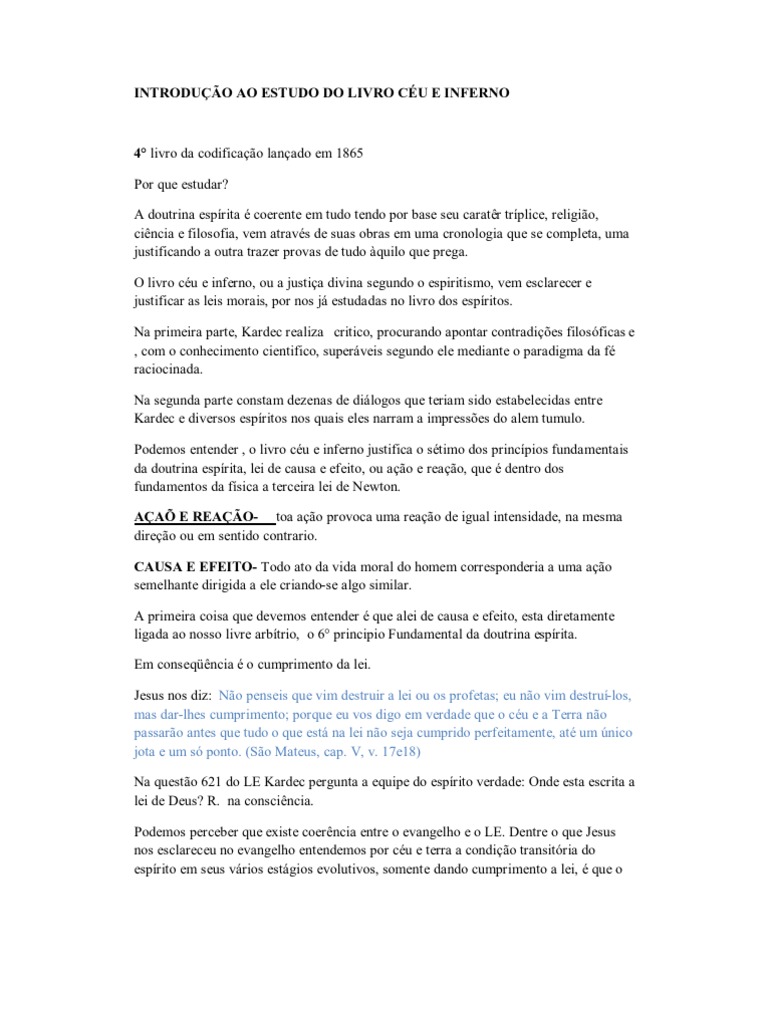 4 livro da codificao lanado em 1865 Por que estudar? A doutrina esprita coerente em tudo tendo por base seu caratr trplice, religio, cincia e filosofia, vem atravs de suas obras em uma cronologia que se completa, uma justificando a outra trazer provas de tudo quilo que prega. O livro cu e inferno, ou a justia divina segundo o espiritismo, vem esclarecer e justificar as leis morais, por nos j estudadas no livro dos espritos. Na primeira parte, Kardec realiza critico, procurando apontar contradies filosficas e , com o conhecimento cientifico, superveis segundo ele mediante o paradigma da f raciocinada. Na segunda parte constam dezenas de dilogos que teriam sido estabelecidas entre Kardec e diversos espritos nos quais eles narram a impresses do alem tumulo. Podemos entender , o livro cu e inferno justifica o stimo dos princpios fundamentais da doutrina esprita, lei de causa e efeito, ou ao e reao, que dentro dos fundamentos da fsica a terceira lei de Newton. AA E REAO- toa ao provoca uma reao de igual intensidade, na mesma direo ou em sentido contrario. CAUSA E EFEITO- Todo ato da vida moral do homem corresponderia a uma ao semelhante dirigida a ele criando-se algo similar. A primeira coisa que devemos entender que alei de causa e efeito, esta diretamente ligada ao nosso livre arbtrio, o 6 principio Fundamental da doutrina esprita. Em conseqncia o cumprimento da lei. Jesus nos diz: No penseis que vim destruir a lei ou os profetas; eu no vim destru-los, mas dar-lhes cumprimento; porque eu vos digo em verdade que o cu e a Terra no passaro antes que tudo o que est na lei no seja cumprido perfeitamente, at um nico jota e um s ponto. (So Mateus, cap. V, v. 17e18) Na questo 621 do LE Kardec pergunta a equipe do esprito verdade: Onde esta escrita a lei de Deus? R. na conscincia. Podemos perceber que existe coerncia entre o evangelho e o LE. Dentre o que Jesus nos esclareceu no evangelho entendemos por cu e terra a condio transitria do esprito em seus vrios estgios evolutivos, somente dando cumprimento a lei, que o