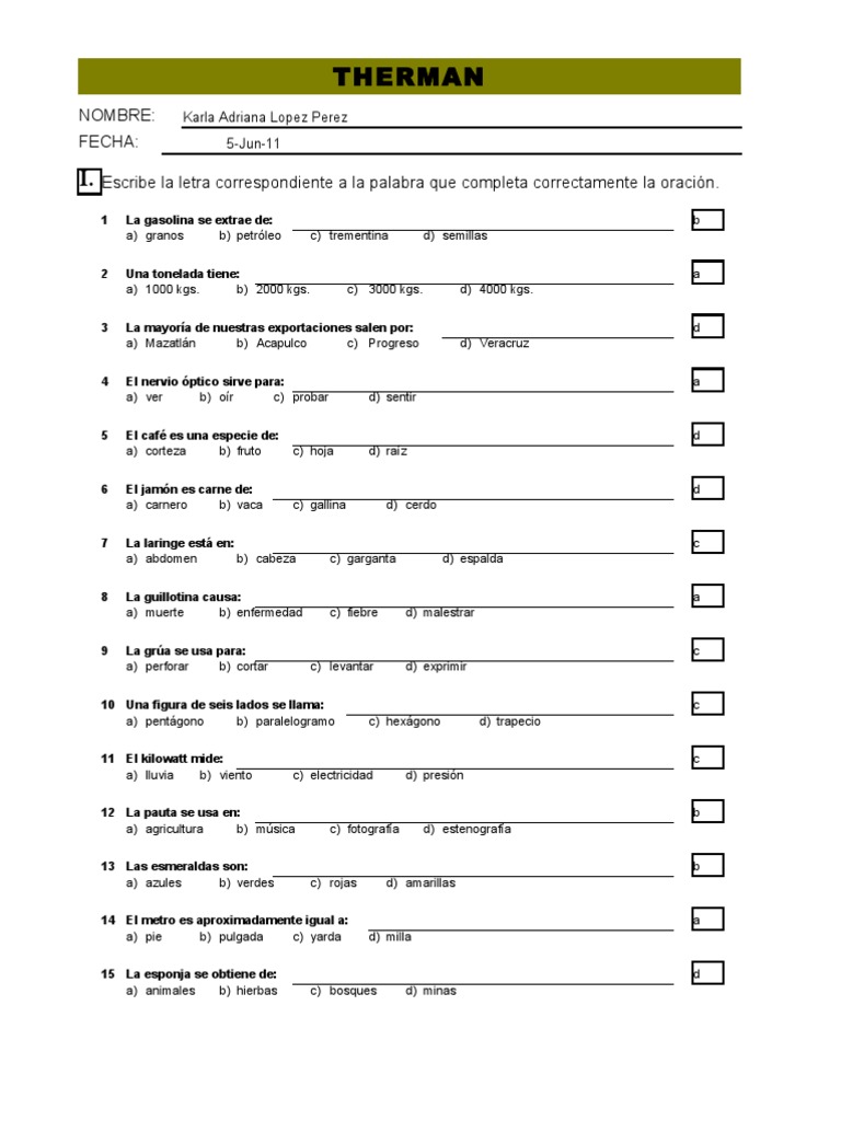 1 La gasolina se extrae de: a) granos b) petrleo Una tonelada tiene: a) 1000 kgs. b) 2000 kgs. b c) trementina d) semillas a c) 3000 kgs. d) 4000 kgs. d d) Veracruz a d) sentir d c) hoja d) raz d c) gallina d) cerdo c c) garganta d) espalda a c) fiebre d) malestrar c c) levantar d) exprimir c c) hexgono d) trapecio c c) electricidad d) presin b c) fotografa d) estenografa b c) rojas d) amarillas a d) milla d c) bosques d) minas