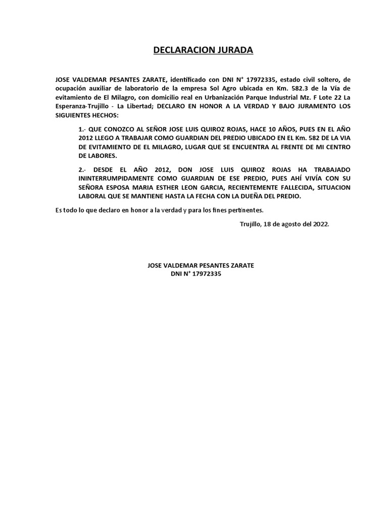 Esperanza-Trujillo - La Libertad; DECLARO EN HONOR A LA VERDAD Y BAJO JURAMENTO LOS