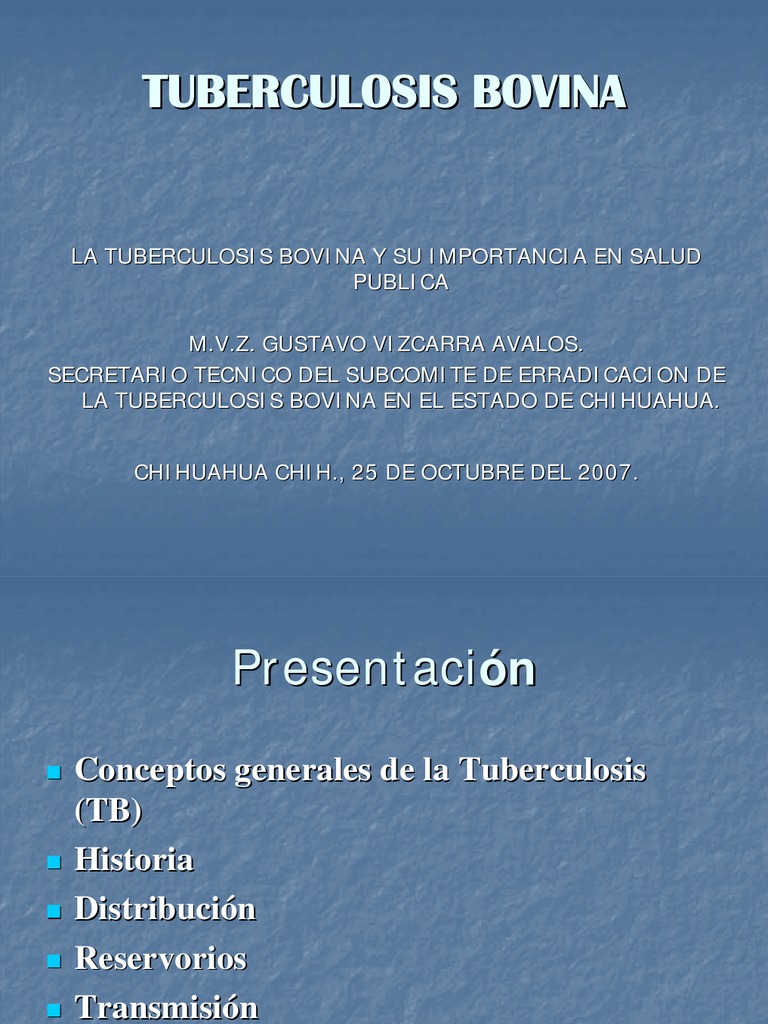 LA TUBERCULOSIS BOVINA Y SU IMPORTANCIA EN SALUD PUBLICA M.V.Z. GUSTAVO VIZCARRA AVALOS. SECRETARIO TECNICO DEL SUBCOMITE DE ERRADICACION DE LA TUBERCULOSIS BOVINA EN EL ESTADO DE CHIHUAHUA. CHIHUAHUA CHIH., 25 DE OCTUBRE DEL 2007.