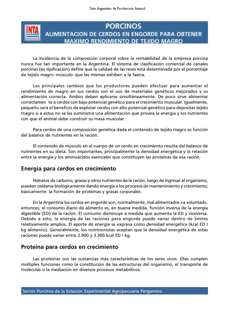 La incidencia de la composicin corporal sobre la rentabilidad de la empresa porcina nunca fue tan importante en la Argentina. El sistema de clasificacin comercial de canales porcinas (ex tipificacn) define que la calidad de las reses est determinada por el porcentaje de tejido magro -msculo- que las mismas exhiben a la faena. Los principales cambios que los productores pueden efectuar para aumentar el rendimiento de magro en sus cerdos son el uso de materiales genticos mejorados y su alimentacin correcta. Ambos deben aplicarse simultneamente. De poco sirve alimentar correctamente a cerdos con bajo potencial gentico para el crecimiento muscular. Igualmente, pequeo ser el beneficio de explotar cerdos con alto potencial gentico para depositar tejido magro si a estos no se les suministra una alimentacin que provea la energa y los nutrientes con que el animal debe construir su masa muscular. Para cerdos de una composicin gentica dada el contenido de tejido magro es funcin del balance de nutrientes en la racin. El contenido de msculo en el cuerpo de un cerdo en crecimiento resulta del balance de nutrientes en su dieta. Son importantes, principalmente la densidad energtica y la relacin entre la energa y los aminocidos esenciales que constituyen las protenas de esa racin.