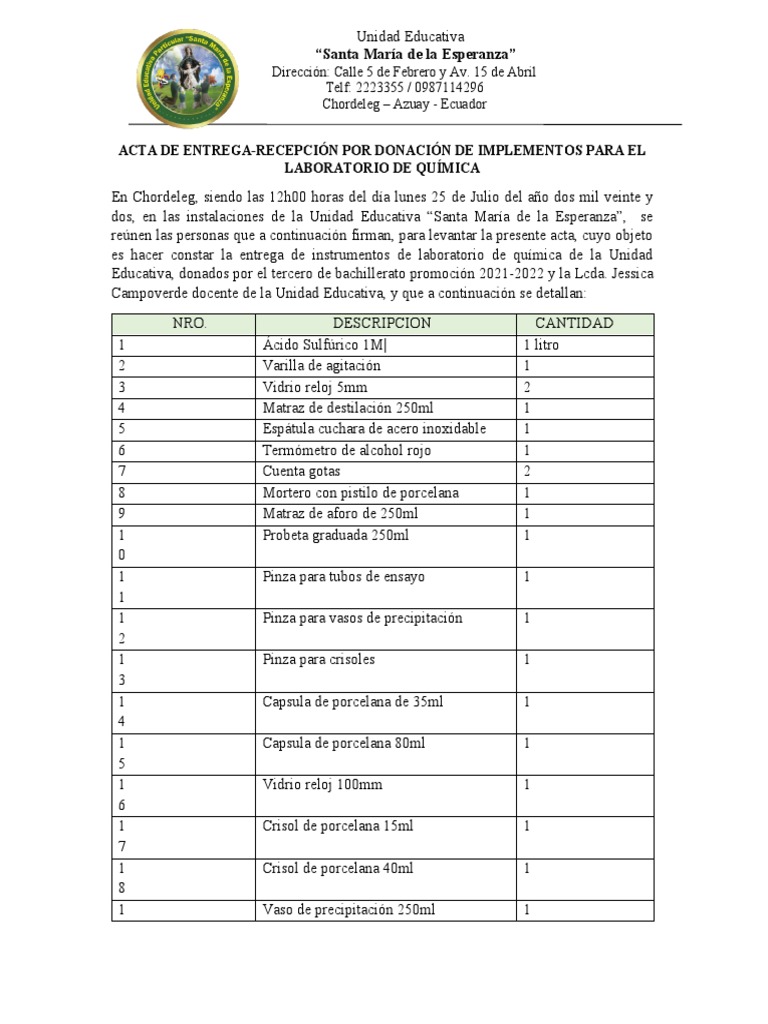 es hacer constar la entrega de instrumentos de laboratorio de química de la Unidad
