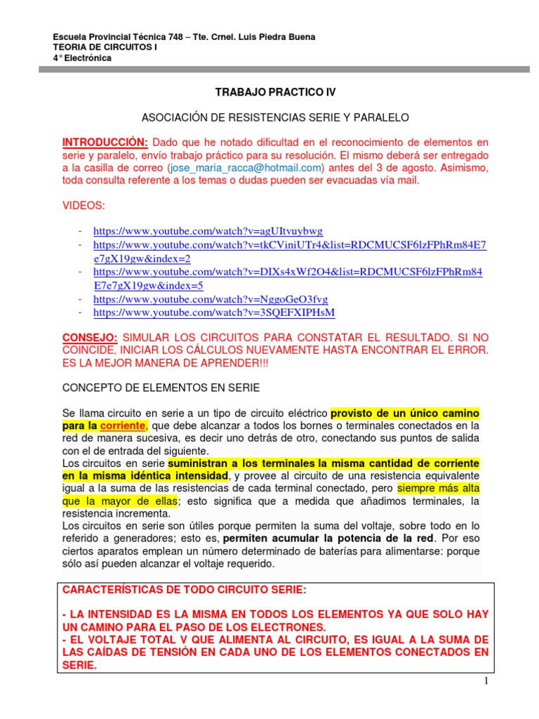 serie y paralelo, envío trabajo práctico para su resolución. El mismo deberá ser entregado