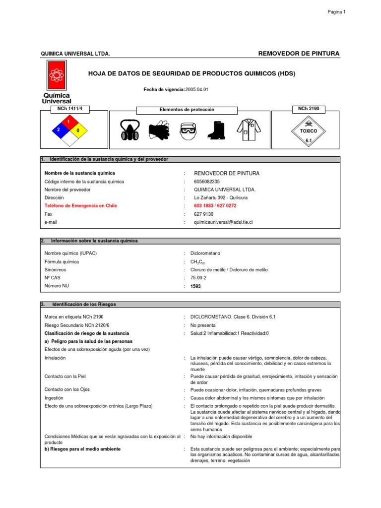 Normas vigentes : : : IMDG / IATA / NU / NFPA / CE / NIOSH NCh 2245 - NCh 382 - NCh 2120/6 - NCh 2190 - D.S. 594 - D.S. 298 DICLOROMETANO. NU 1593. Txico. Clase 6.1