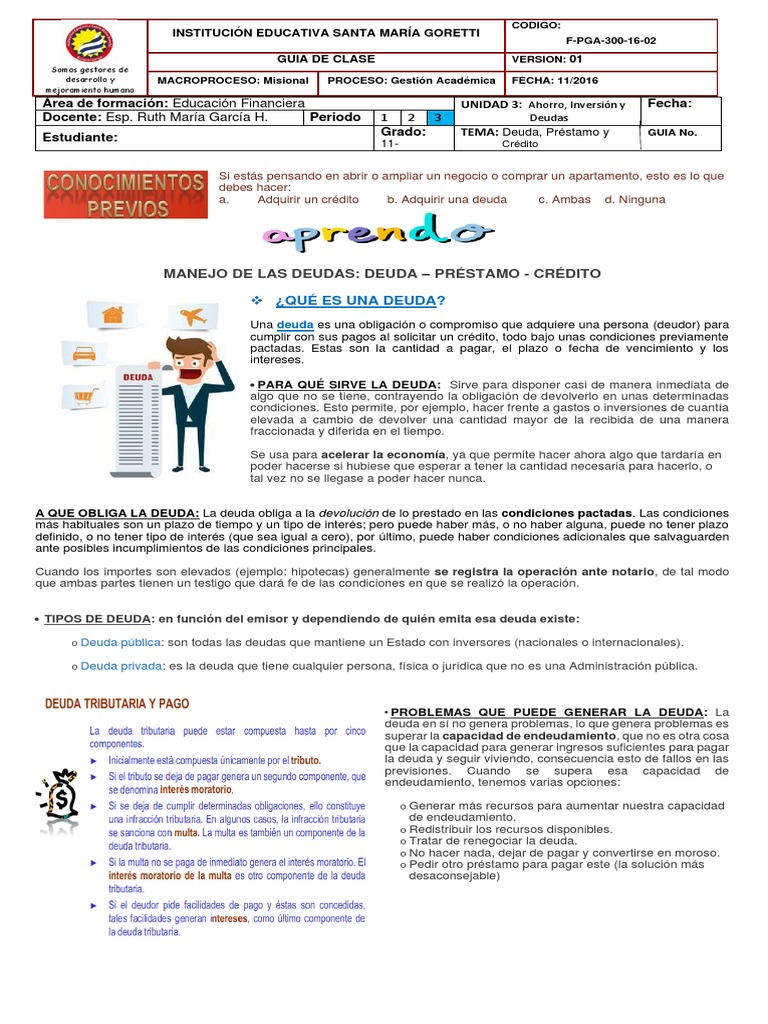 Grado: TEMA: Deuda, Préstamo y GUIA No.