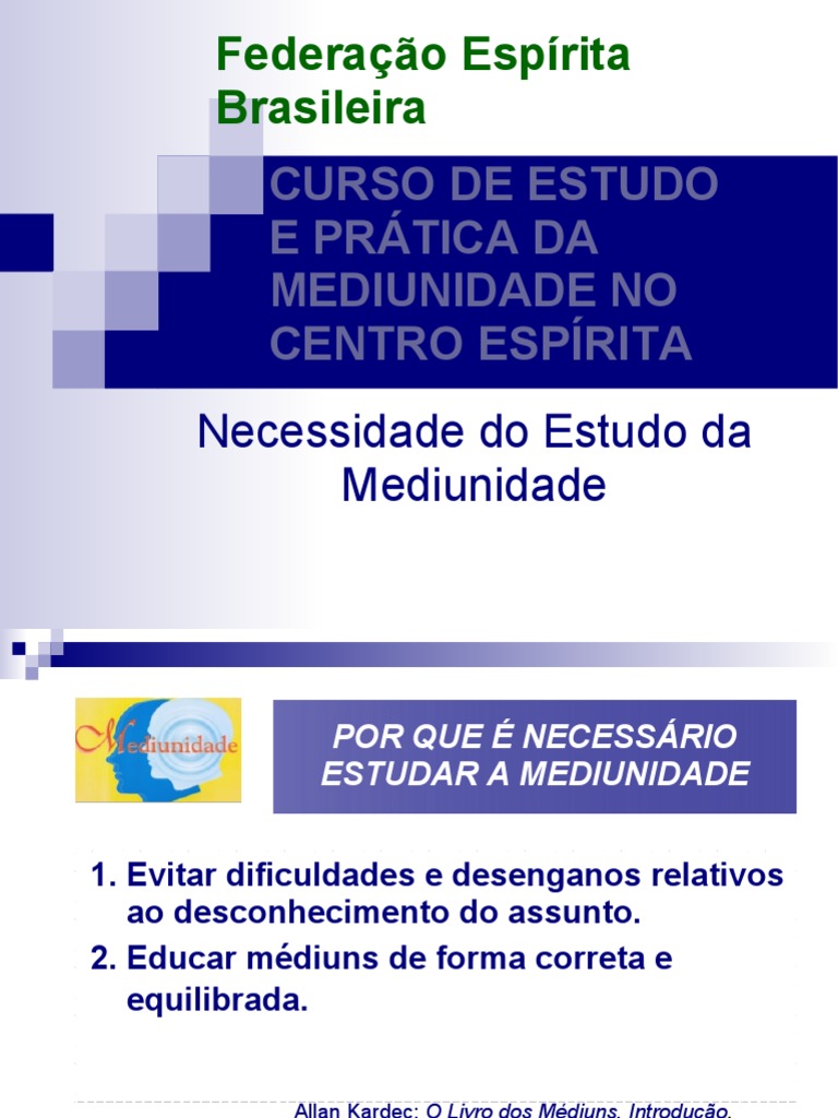 POR QUE NECESSRIO ESTUDAR A MEDIUNIDADE 1. Evitar dificuldades e desenganos relativos ao desconhecimento do assunto. 2. Educar mdiuns de forma correta e equilibrada.