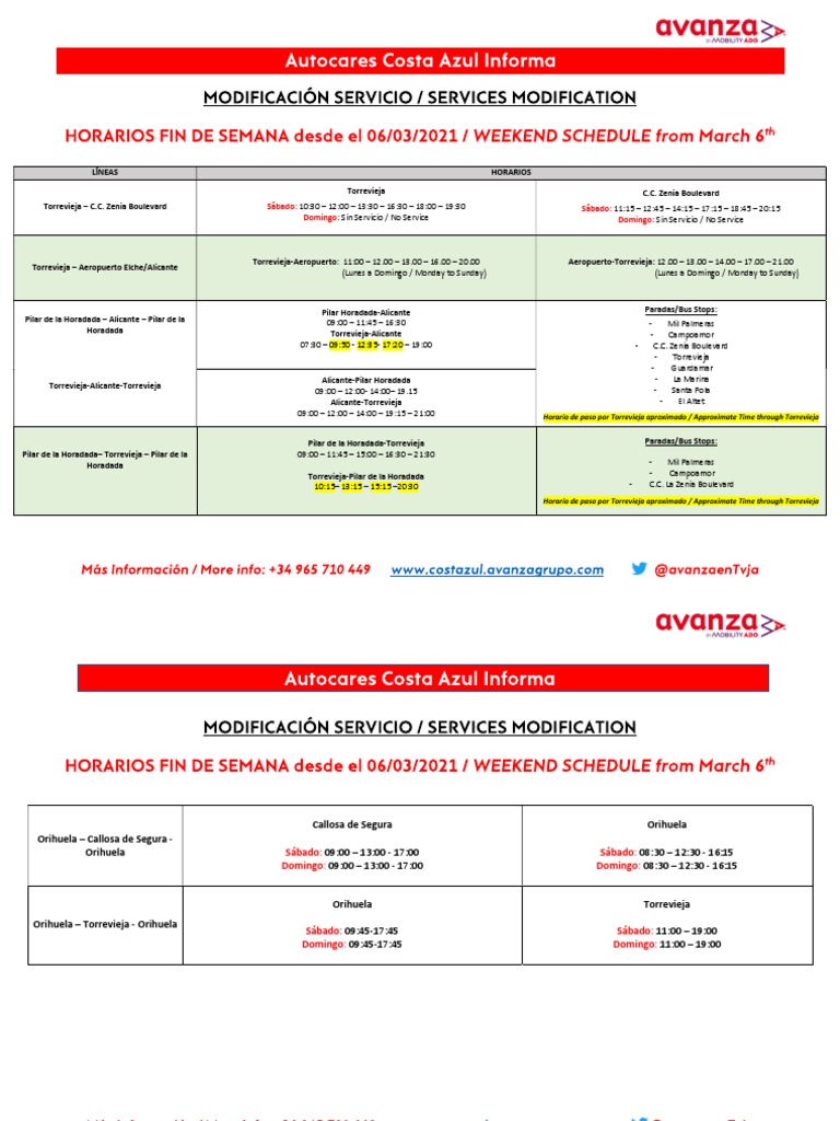09:00 – 12:00 – 14:00 – 19:15 – 21:00 Horario de paso por Torrevieja aproximado / Approximate Time through Torrevieja