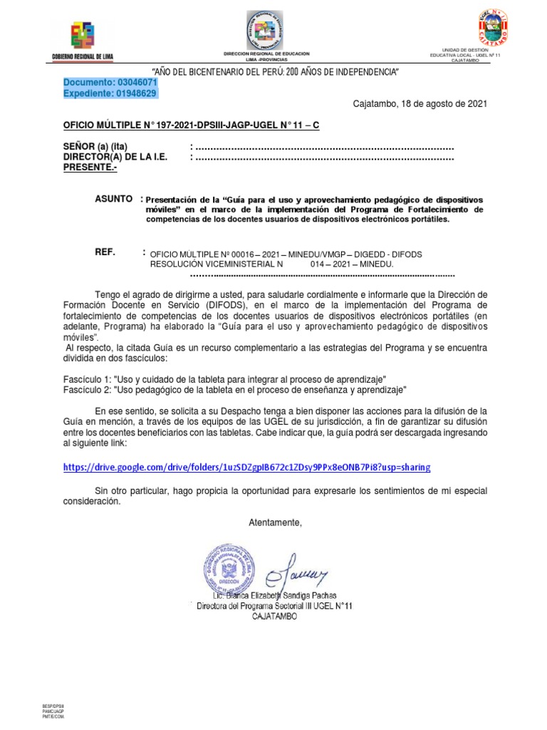OFICIO MÚLTIPLE N° 197-2021-DPSIII-JAGP-UGEL N° 11 – C
