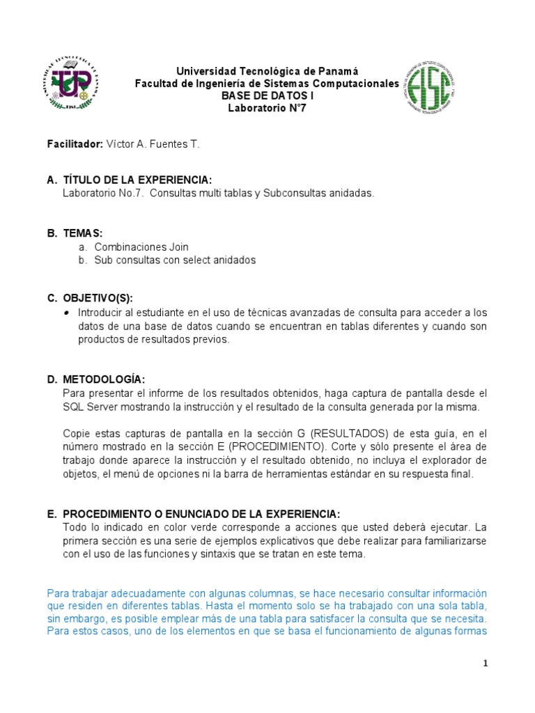 Laboratorio No.7. Consultas multi tablas y Subconsultas anidadas.