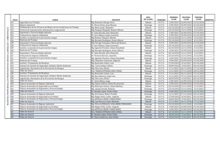 4A Tópicos Avanzados de Higiene Industrial Mg. Ospina Salinas, Estela Encarnación Sábado 8-17 h. 3/09/2022 24/09/2022 15/10/2022 6