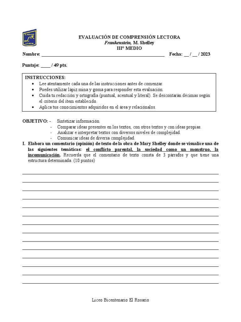 I. Elabora un comentario (opinión) de texto de la obra de Mary Shelley donde se visualice una de