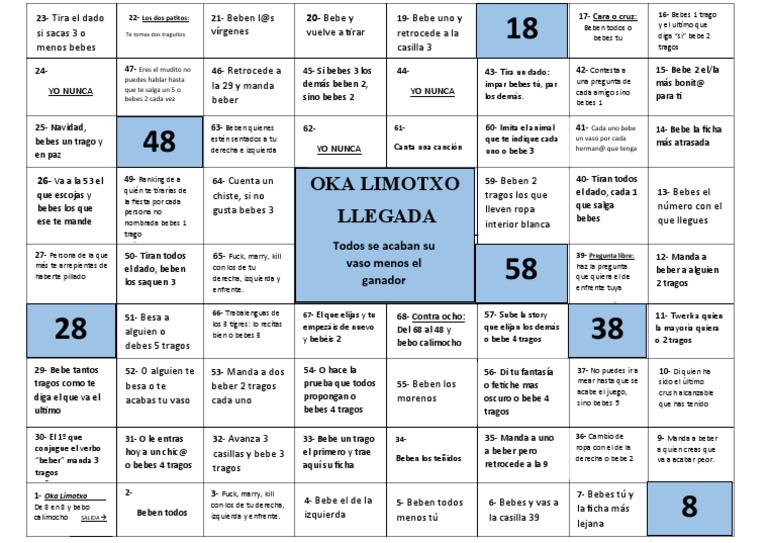 24- 47- Eres el mudito no 46- Retrocede a 45- Si bebes 3 los 44- 43- Tira un dado: 42- Contesta a 15- Bebe 2 el/la