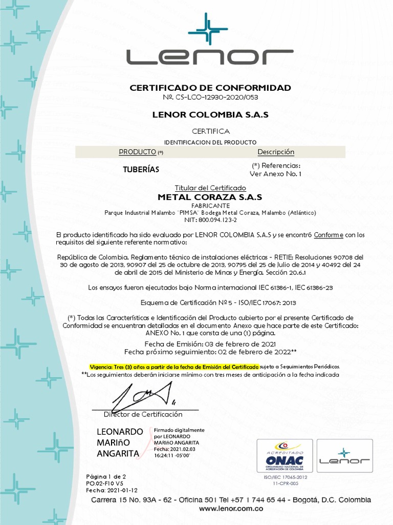 El producto identificado ha sido evaluado por LENOR COLOMBIA S.A.S y se encontró Conforme con los