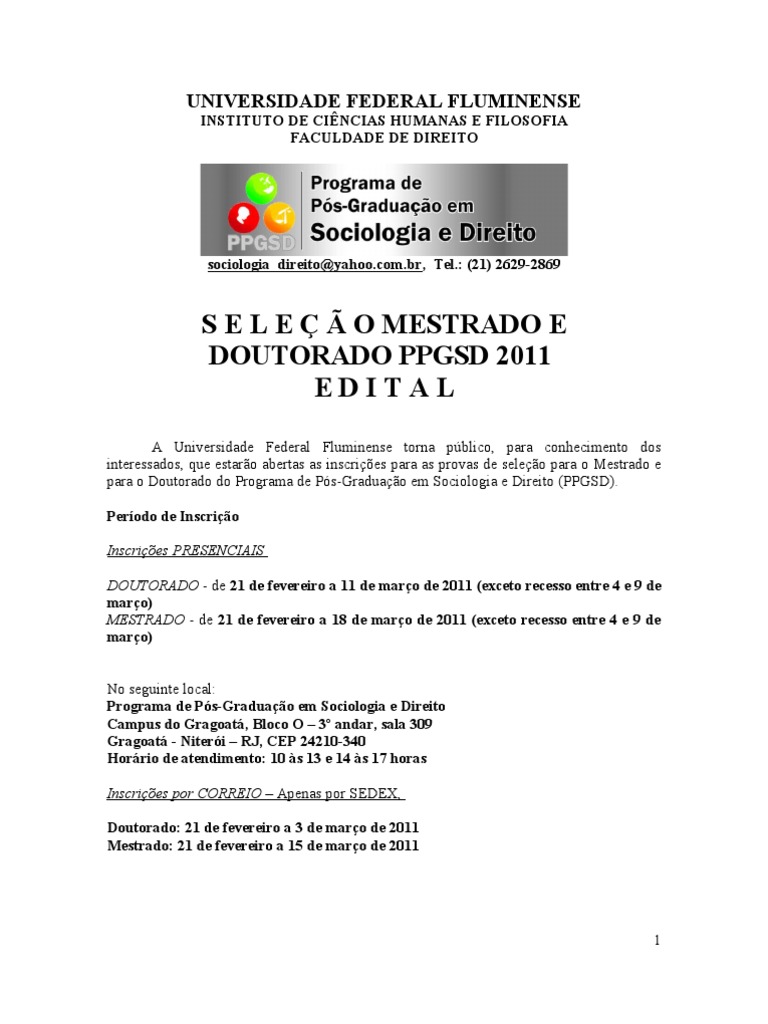 de uma cultura sedimentada de valores de justia, solidariedade e direitos. No atual processo histrico, em que se verifica a colonizao da economia sobre outras esferas, torna-se necessria a reflexo sobre a justia social. A linha de pesquisa d nfase questo da desigualdade para uma reflexo sobre a democracia, a cidadania e o direito. Muitas das questes tericas e prticas, que so objeto de discusso dos direitos humanos, podem contribuir para o debate nos planos da Filosofia do Direito, da tica e da Poltica, bem como na elaborao de planos e estratgias para uma sociedade menos injusta. Conflitos Socioambientais e Urbanos - Os conflitos permeiam os prprios processos de deciso, em especial os modelos de gesto sobre os territrios. Desse modo, os conceitos de conflitos socioambientais e urbanos colocam-se em relao noo de injustia ambiental e territorial, enquanto condio de existncia prpria a sociedades desiguais onde operam mecanismos sociopolticos que destinam a maior parte dos danos ambientais do desenvolvimento a grupos sociais de trabalhadores, populaes de baixa renda, comunidades tradicionais e segmentos raciais discriminados. O estabelecimento de premissas para a questo ambiental e urbana perpassa a participao democrtica nos planejamentos territoriais, sejam eles Planos Diretores, Planos de Manejo de Unidades de Conservao ou Planos de Desenvolvimento Agrrios. 1.3. Funcionamento As aulas ocorrem semanalmente nos turnos da manh, tarde e noite, tanto no ICHF (Instituto de Cincias Humanas e Filosofia), no Bloco O, no campus do Gragoat, quanto na Faculdade de Direito, na Rua Presidente Pedreira 62. Obs. Maiores informaes sobre o corpo docente, suas atividades atuais, linhas, grupos e projetos de pesquisa podero ser obtidos no endereo eletrnico do programa (www.uff.br) ou na Plataforma Lattes (www.cnpq.br). 1.4. Das bancas A seleo ser efetuada por 04 (quatro) bancas indicadas pelos setores temticos (linhas de pesquisa) do Programa, composta pelos professores a elas identificados. Ao preencherem a ficha de inscrio, os candidatos devem optar por um dos setores temticos, assinalando o campo apropriado. O candidato dever optar pelo setor cujas temticas mais se aproximem daquela que se prope a desenvolver em seu projeto de pesquisa. A coordenao do PPGSD exercer a presidncia geral da seleo.