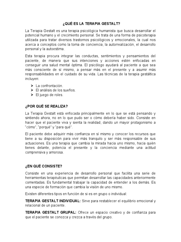 La Terapia Gestalt es una terapia psicológica humanista que busca desarrollar el