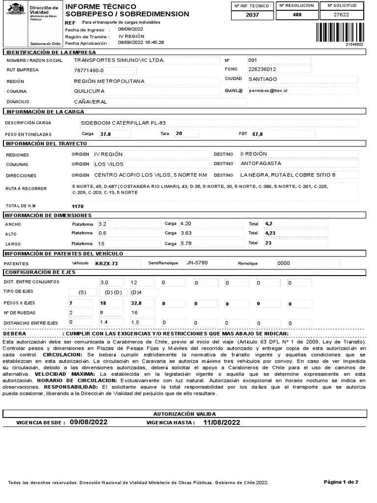 observaciones. RESPONSABILIDAD: El solicitante asume la total responsabilidad por los da ños que el transporte que se autoriza