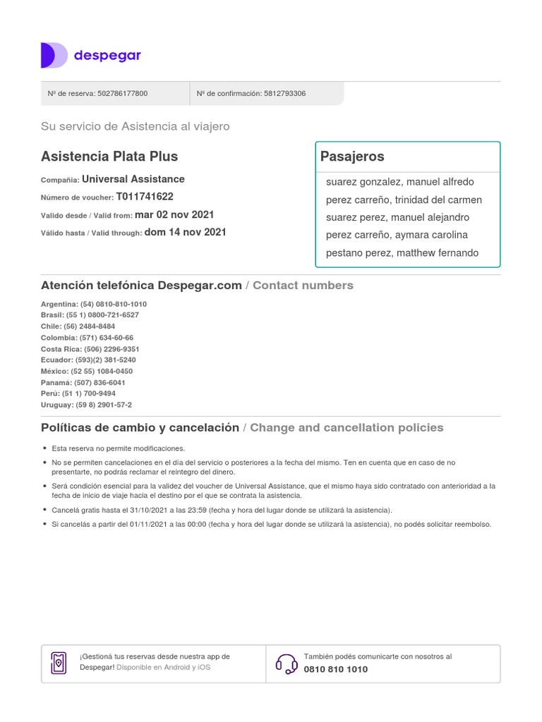 Si cancelás a partir del 01/11/2021 a las 00:00 (fecha y hora del lugar donde se utilizará la asistencia), no podés solicitar reembolso.
