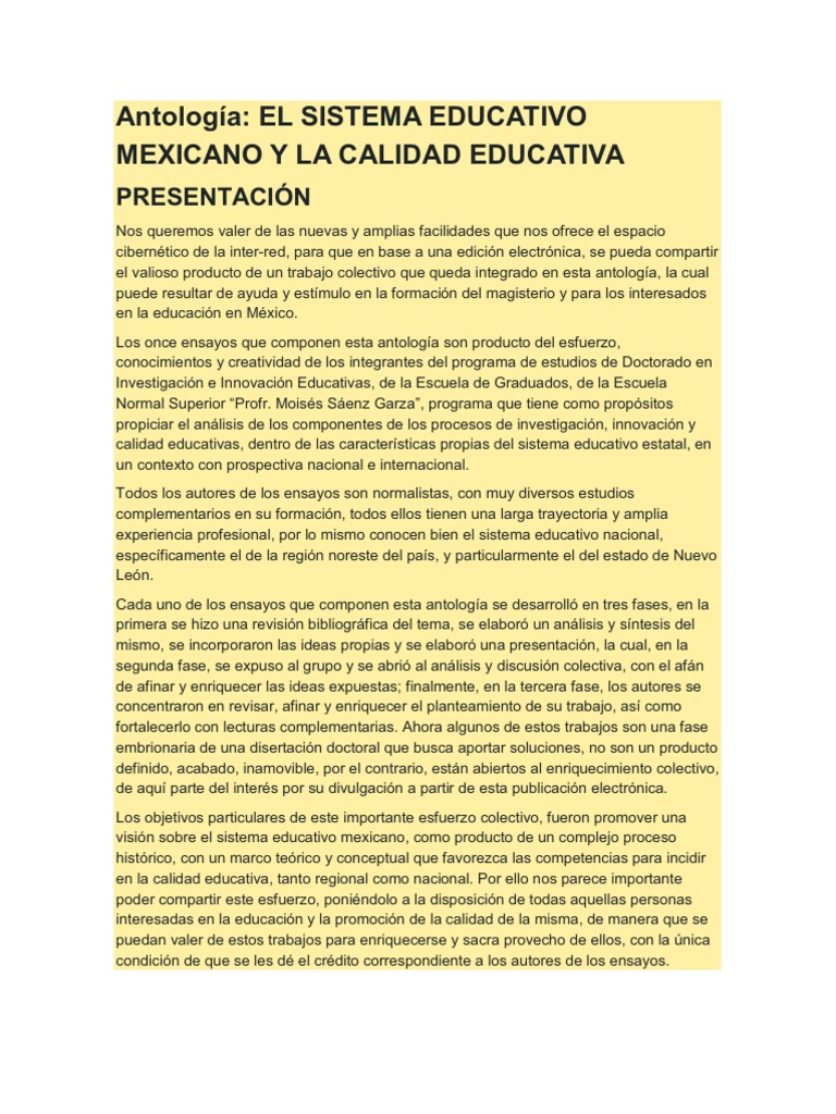 Nos queremos valer de las nuevas y amplias facilidades que nos ofrece el espacio ciberntico de la inter-red, para que en base a una edicin electrnica, se pueda compartir el valioso producto de un trabajo colectivo que queda integrado en esta antologa, la cual puede resultar de ayuda y estmulo en la formacin del magisterio y para los interesados en la educacin en Mxico. Los once ensayos que componen esta antologa son producto del esfuerzo, conocimientos y creatividad de los integrantes del programa de estudios de Doctorado en Investigacin e Innovacin Educativas, de la Escuela de Graduados, de la Escuela Normal Superior Profr. Moiss Senz Garza, programa que tiene como propsitos propiciar el anlisis de los componentes de los procesos de investigacin, innovacin y calidad educativas, dentro de las caractersticas propias del sistema educativo estatal, en un contexto con prospectiva nacional e internacional. Todos los autores de los ensayos son normalistas, con muy diversos estudios complementarios en su formacin, todos ellos tienen una larga trayectoria y amplia experiencia profesional, por lo mismo conocen bien el sistema educativo nacional, especficamente el de la regin noreste del pas, y particularmente el del estado de Nuevo Len. Cada uno de los ensayos que componen esta antologa se desarroll en tres fases, en la primera se hizo una revisin bibliogrfica del tema, se elabor un anlisis y sntesis del mismo, se incorporaron las ideas propias y se elabor una presentacin, la cual, en la segunda fase, se expuso al grupo y se abri al anlisis y discusin colectiva, con el afn de afinar y enriquecer las ideas expuestas; finalmente, en la tercera fase, los autores se concentraron en revisar, afinar y enriquecer el planteamiento de su trabajo, as como fortalecerlo con lecturas complementarias. Ahora algunos de estos trabajos son una fase embrionaria de una disertacin doctoral que busca aportar soluciones, no son un producto definido, acabado, inamovible, por el contrario, estn abiertos al enriquecimiento colectivo, de aqu parte del inters por su divulgacin a partir de esta publicacin electrnica. Los objetivos particulares de este importante esfuerzo colectivo, fueron promover una visin sobre el sistema educativo mexicano, como producto de un complejo proceso histrico, con un marco terico y conceptual que favorezca las competencias para incidir en la calidad educativa, tanto regional como nacional. Por ello nos parece importante poder compartir este esfuerzo, ponindolo a la disposicin de todas aquellas personas interesadas en la educacin y la promocin de la calidad de la misma, de manera que se puedan valer de estos trabajos para enriquecerse y sacra provecho de ellos, con la nica condicin de que se les d el crdito correspondiente a los autores de los ensayos.