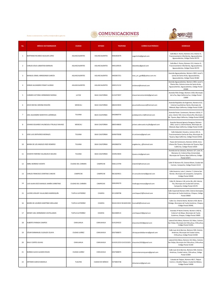 No. MÉDICO DICTAMINADOR CIUDAD ESTADO TELÉFONO CORREO ELECTRÓNICO DOMICILIO