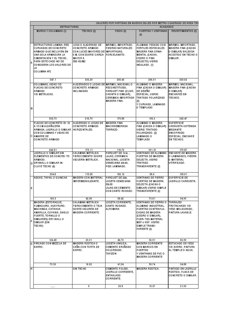 VALORES POR PARTIDAS EN NUEVOS SOLES POR METRO CUADRADO DE AREA TECHADA