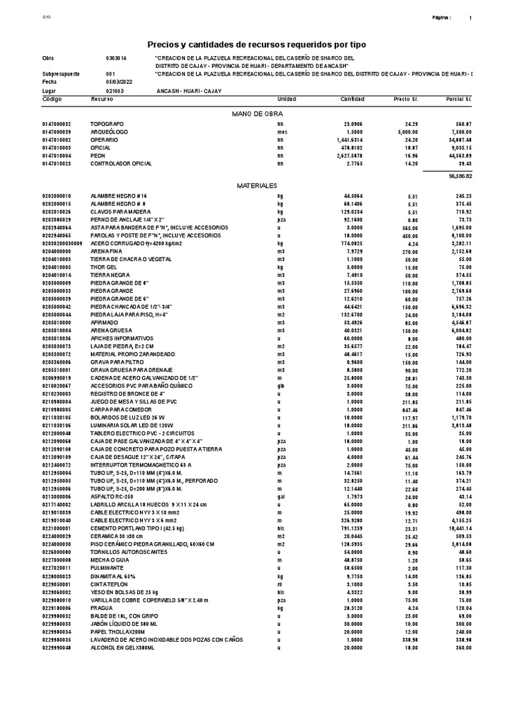 Código Recurso Unidad Cantidad Precio S/. Parcial S/.