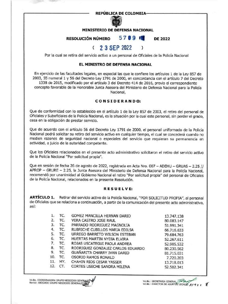 CContinuacién de la Resolucién "Po ln cual se rete del servicio activo a un personal de Ofideles de la Policia Nacionr’. Encabera el