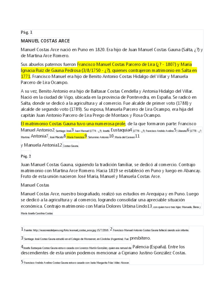 1 Fuente: http://masonesdelperu.org/foto/manuel_costas_arce.jpg 15/7/2016. 2 Francisco Manuel Antonio Costas Gauna falleció siendo aún infante.