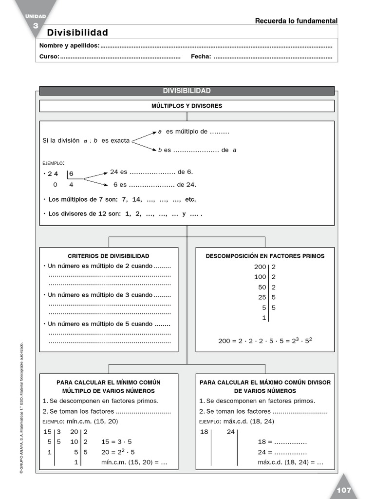 máx.c.d. (8, 12, 24) = 4 © GRUPO ANAYA, S.A. Matemáticas 1.° ESO. Material fotocopiable autorizado.