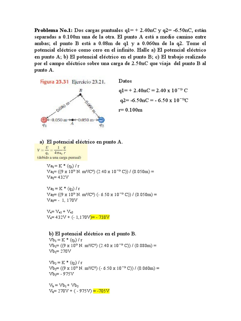 Va1= ((9 x 10⁹ N. m²/C²) (2.40 x 10 ̄ ⁹ C)) / (0.050m) =