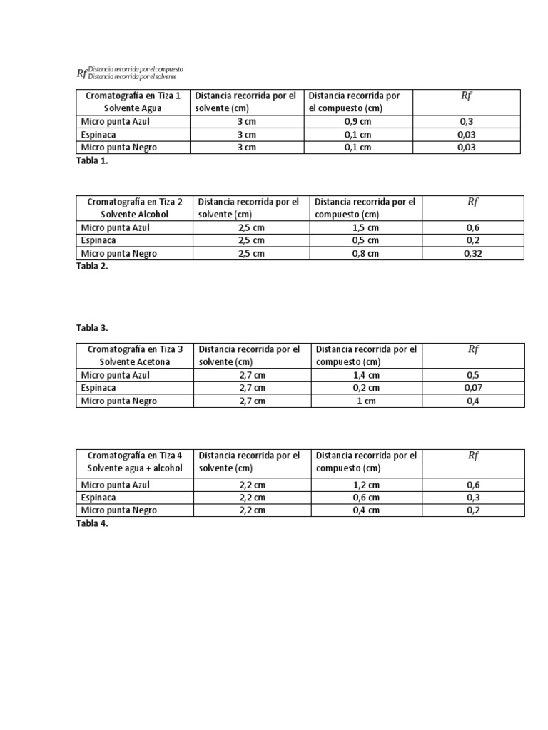 Cromatografía en Tiza 1 Distancia recorrida por el Distancia recorrida por Rf