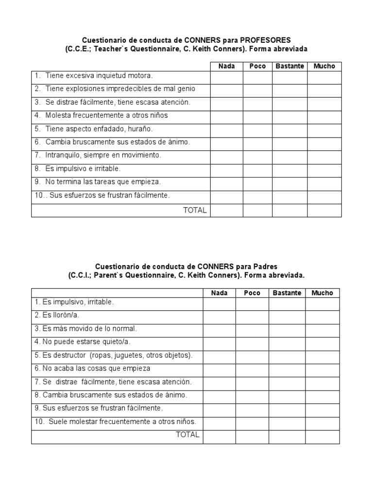(C.C.I.; Parent`s Questionnaire, C. Keith Conners). Forma abreviada.