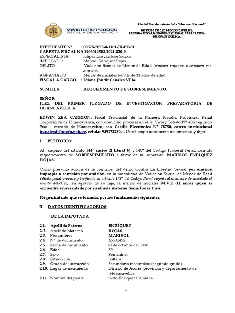 El Requerimiento de Sobreseimiento en la presente causa seguida contra Marisol Enriquez