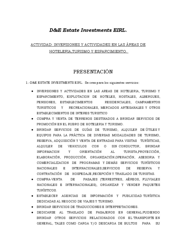 1.-D&E ESTATE INVESTMENTS EIRL. Se crea para los siguientes servicios: