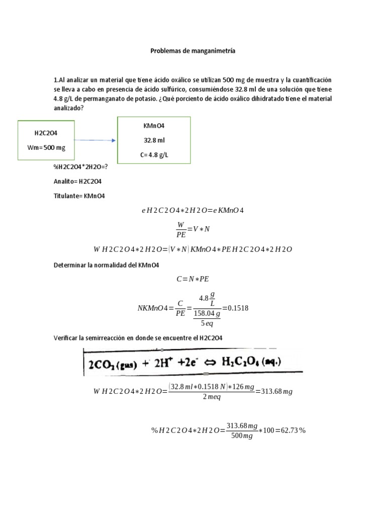 W H 2C 2 O 4∗2 H 2 O= (V ∗N ) KMnO 4∗PE H 2C 2O 4∗2 H 2O