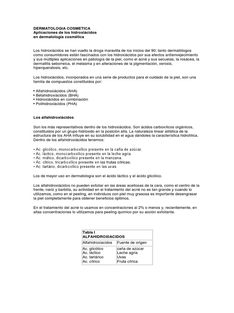 Dentro de los hidroxiácidos, los alfahidroxiácidos tienen mayor aplicación en dermatología y el