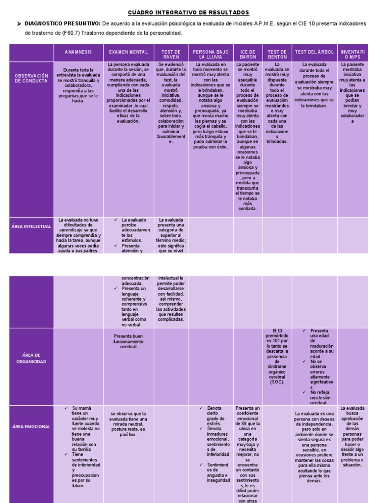 DIAGNOSTICO PRESUNTIVO: De acuerdo a la evaluación psicológica la evaluada de iniciales A.P.M.E. según el CIE 10 presenta indicadores