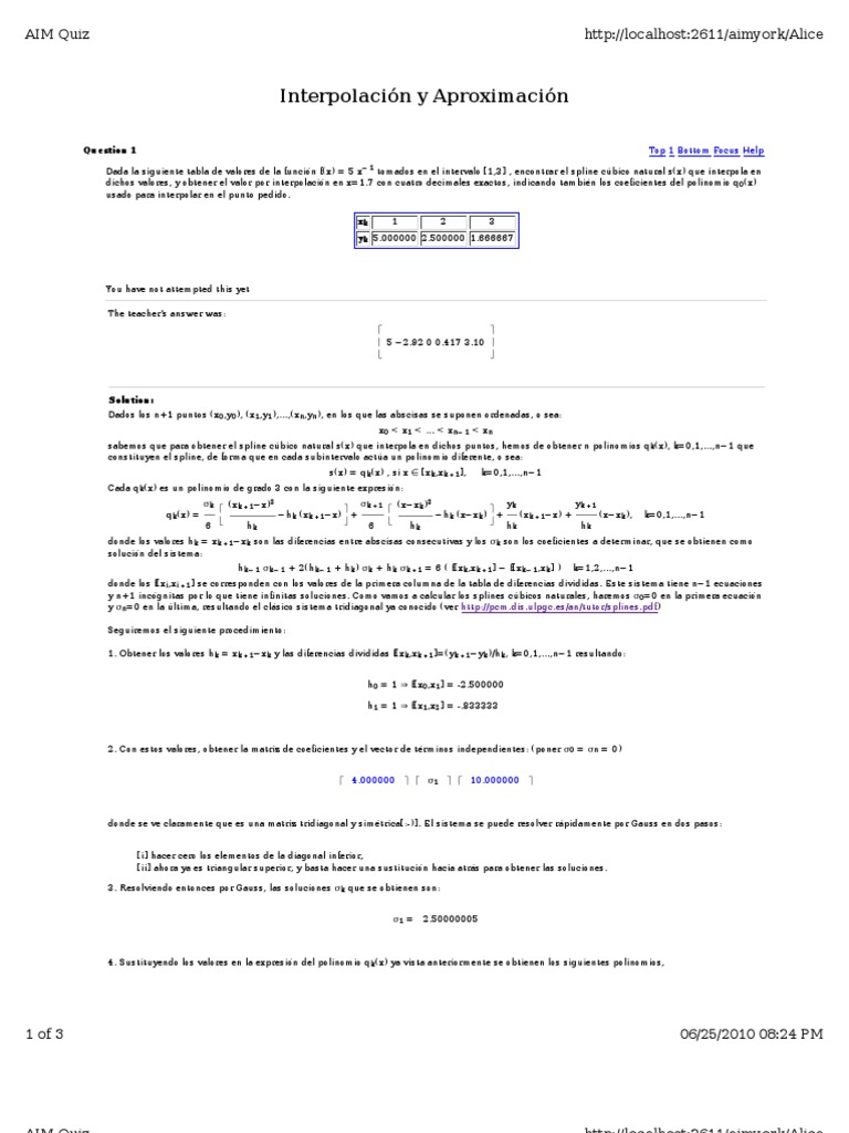 Solution: Dados los n+1 puntos (x0,y0), (x1,y1),...,(xn,yn), en los que las abscisas se suponen ordenadas, o sea: x0 < x1 < ... < xn1 < xn sabemos que para obtener el spline cbico natural s(x) que interpola en dichos puntos, hemos de obtener n polinomios qk (x), k=0,1,...,n1 que constituyen el spline, de forma que en cada subintervalo acta un polinomio diferente, o sea: s(x) = q k (x) , si x [xk ,xk+1], Cada qk (x) es un polinomio de grado 3 con la siguiente expresin: qk (x) = k