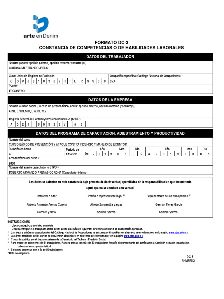 4/ Para empresas con menos de 51 trabajadores. Para empresas con más de 50 trabajadores firmaría el representante del patrón ante la Comisión mixta de capacitación,